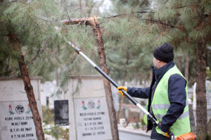 Müdürlük bünyesinde oluşturulan, her biri 10 kişiden oluşan iki ayrı ekip, mezarlıklarda ve mahallelerde bulunan ağaçlarda budama çalışmaları gerçekleştiriyor.