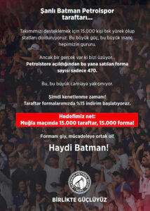 Lider Batman Petrolspor, hafta sonu Muğlaspor ile oynayacağı kritik maç öncesi taraftarlarını forma almaya ve statları doldurmaya davet ediyor. Petrolstore’de forma satışlarına özel indirim yapıldı.