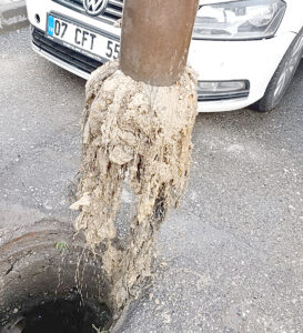 Beşevler Mahallesi’nde gerçekleştirilen baca temizleme çalışmaları sırasında ekipler, kanalizasyon hatlarında çam ağacı, bez parçaları, kadın pedleri, kağıt, karton, jelatin ve ayakkabı gibi birçok farklı atıkla karşılaştı. Çalışmalar esnasında çıkarılan malzemeler, görenleri hayrete düşürdü.