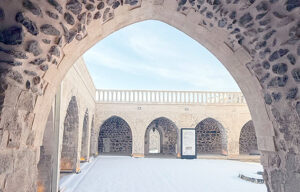 Yoğun kar yağışının etkisiyle manastırın avlusu ve asırlık taş duvarları, sessizliğin ve tarihin iç içe geçtiği eşsiz bir manzara sunuyor.